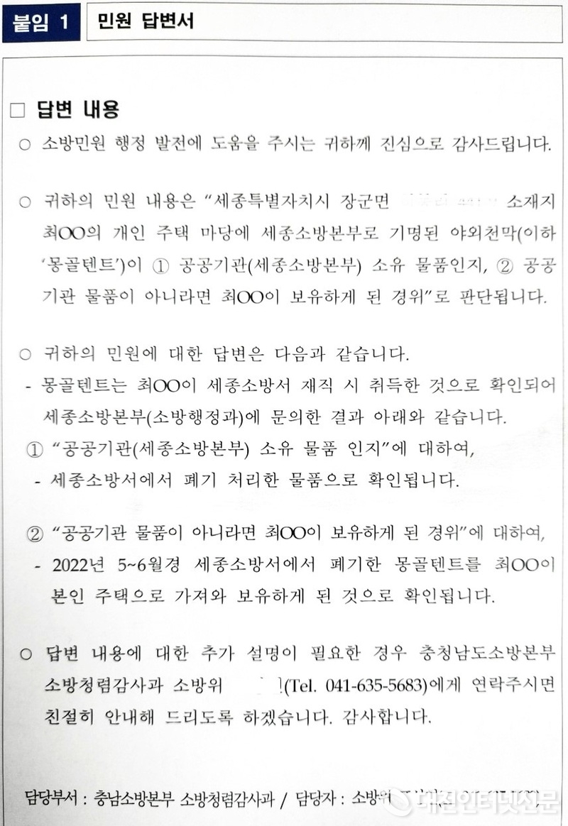 김 의원에 따르면 “최근 세종소방본부 마크가 찍혀있는 몽골 텐트가 장군면 하봉리 한 개인 주택에서 버젓이 사용되고 있다는 시민의 제보가 들어왔고 이에 김 의원이 세종소방본부에 자료를 요청해 조사한 결과, 내용 연수도 도래하지 않는 소방서의 자산성 물품을 소방관계자(당시 센터장)가 개인적으로 사용했음이 확인됐으며, 이후 반납한 사례가 있었다”라고 밝혔다.
