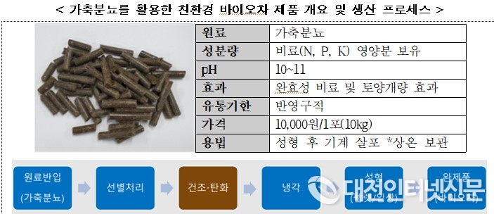 경동개발과 바이오씨앤씨는 각각 소똥과 닭똥을 350℃이상의 온도에서 열처리하여 펠렛 형태의 고체비료(bio-char)로 생산하는 신공법을 실증한다. 바이오차는 악취가 거의 없고 기존비료 대비 효율이 2배 높을 뿐만 아니라 미세다공 구조 특성상 65~89%의 탄소가 땅속에 고정(1톤의 바이오차를 뿌리면 1.8톤의 CO2 저감 가능, 가축분뇨 처리의 87%를 차지하는 퇴비·액체비료는 내부탄소가 CO2 형태로 배출)된다. 현행 법령상 가축분뇨는 퇴비, 액체비료, 바이오가스, 고체연료의 방식으로만 처리할 수 있어 유사시설의 기준을 준수하는 조건으로 특례를 승인했다. 악취, 온실가스 배출 등 기존 처리방식의 한계를 극복할 수 있는 기술혁신 사례로 평가된다.
