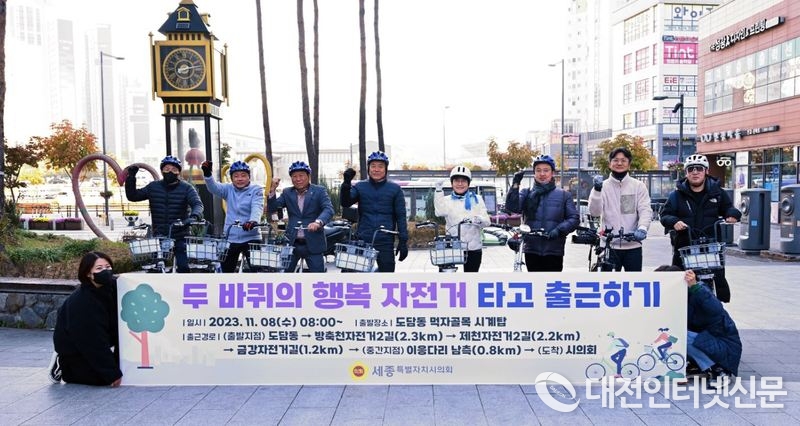 [대전인터넷신문=세종/권혁선 기자] 세종시의회는 8일 오전 8시부터 도담동 먹자골목 시계탑에서 ‘두 바퀴의 행복, 자전거 타고 출근하기’ 행사를 진행했다.