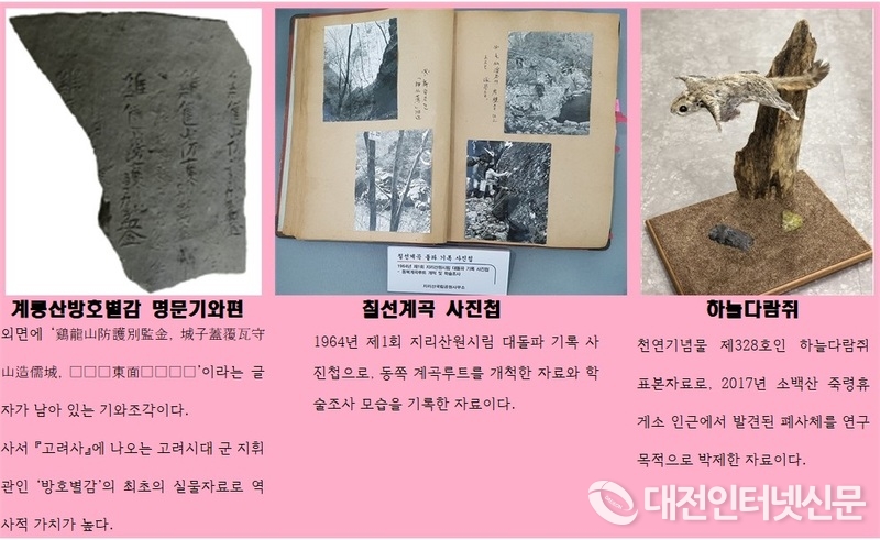 특히, 박물관에는 사서 『고려사』에 나오는 고려시대 군 지휘관인 ‘방호별감’의 최초의 실물자료로 역사적 가치가 높은 ‘계룡산방호별감 명문기와편’, ‘머릿장’, 1964년 제1회 지리산원시림 대돌파 기록인 ‘칠선계곡 사진첩’, 2017년 소백산 죽령휴게소 인근에서 발견된 천연기념물 제328호인 하늘다람쥐를 연구목적으로 박제한 ‘하늘다람쥐’ 등이 전시, 방문객들의 호기심을 자극할 것으로 보인다.