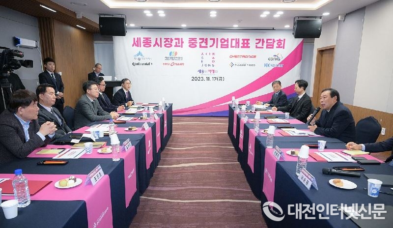 최민호 세종시장은 17일 베스트웨스턴플러스호텔세종에서 관내 7개 중견기업 대표와 간담회를 열고, 지역 기업과 상생발전을 통한 지역경제의 지속 성장 방안을 논의했다. [사진-대전인터넷신문]