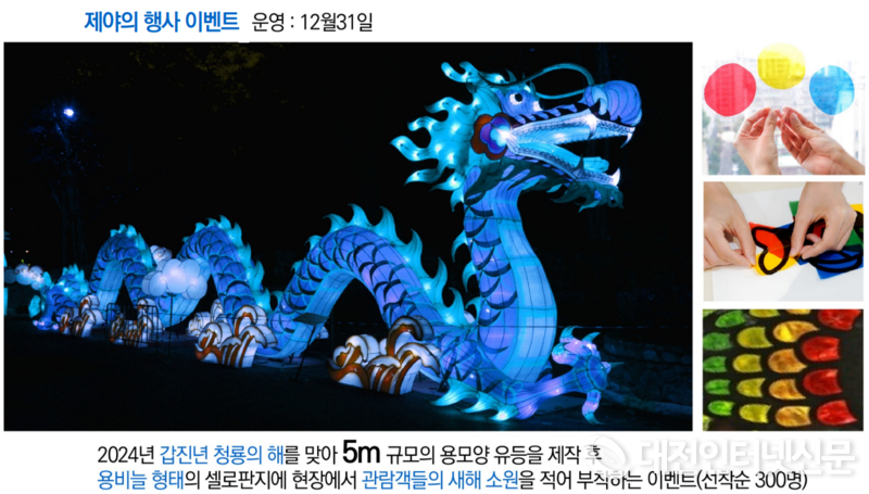 축제 마지막 날인 12월 31일에는 제야의 행사를 운영하여 온 시민이 함께 희망찬 새해를 맞는 시간을 가질 계획이다. 2024년 갑진년 청룡의 해를 맞이해 용 모양 유등을 제작, 현장에서 용 비늘 형태의 셀로판지에 관람객들이 새해 소원을 적어 부착하는 이벤트가 진행될 예정이다. 또한, 시청 여민실에서는 송년 음악회가 개최되고, 실외 이응다리 남측에서는 흥겨운 난타 공연이 펼쳐진다.