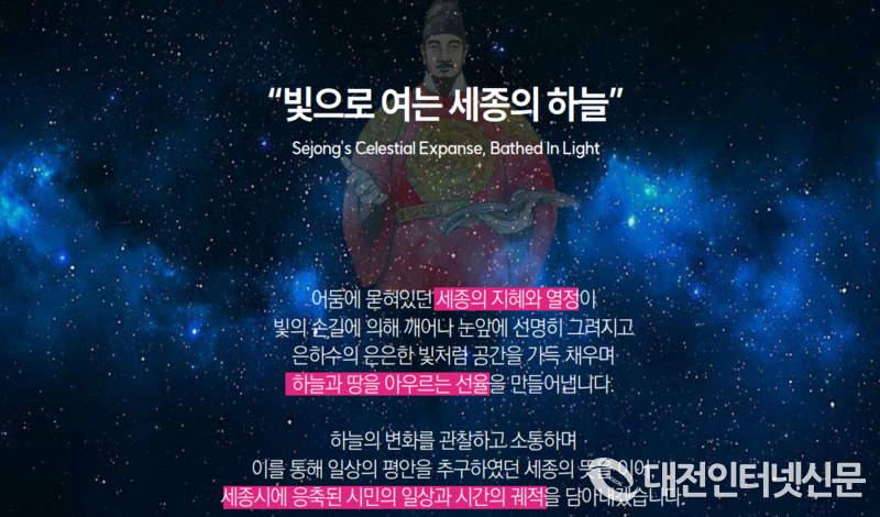 우선, 화려하고 예술적인 영상 콘텐츠인 ‘미디어파사드’와 ‘레이저쇼’를 통해 기억에 남을 추억을 선사하기 위해 축제 공간을 3개의 테마(‘세종의 빛’, ‘일상의 빛’, ‘여민락, 빛과 소리의 공간’)로 구분해 세종의 지혜와 애민 정신을 빛으로 구현한 다채로운 ‘빛 조형물’을 볼 수 있게 연출했다.