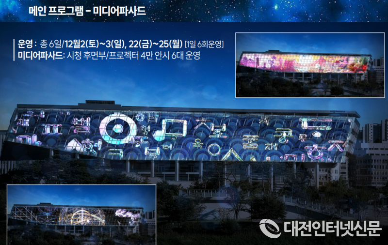 12월 2~3일, 22~25일에는 세종시청사 후면부에 미디어파사드가 구현될 예정이다. 미디어파사드는 세종시에서 처음으로 4만 안시 프로젝터 6대로 운영되며, ‘빛과 시간의 환희’를 주제로 연출된다. 메인 콘텐츠는 총 3막으로 구성되어 소리 문자인 한글, 우리만의 천체 시스템을 구축한 창의성과 이를 바탕으로 세종시의 미래를 압도적 규모의 입체적 영상으로 구현한다. 특히 22일부터 25일까지 크리스마스 시즌에는 산타의 선물공장을 모티브로 한 입체영상을 연출할 예정이다.