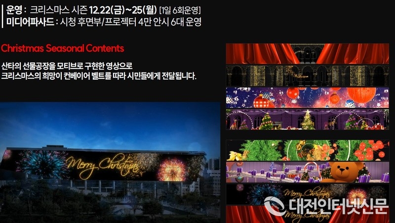 개막식 당일인 2일과 3일 22일, 23일, 24일, 25일에는 메인 프로그램인 미디어파사드가 시청 후면부를 배경으로 산타의 선물광장을 모티브로 한 영상이 펼쳐져 크리스마스의 여운을 시민들에게 전달할 예정이다.