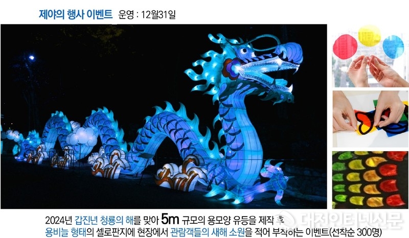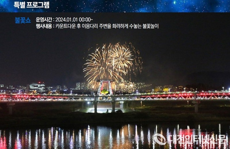 특히, 연말 제야 행사로 ▲12월 31일 22시 30분부터 23시 30분까지 시청 여민 실에서 실내 송년음악회가, ▲23시 10분부터 이응 다리 남측광장에서는 지역예술인들이 참여하는 야외공연과 주요 내빈이 참석 덕담과 신년인사를 곁들인 참여자들과 신나는 새해 풍물놀이, 소원 부착 이벤트, 23시 50분부터는 대망의 새해를 맞이하기 위한 카운트다운 후 이응 다리 주변에서 화려한 불꽃놀이가 2023 세종 빛 축제의 대미를 장식할 예정이다.
