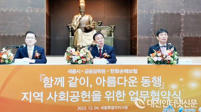 [대전인터넷신문=세종/권혁선 기자] 세종시가 4일 시청 책문화센터에서 최민호 시장과 이복현 금융감독원장, 나채범 한화손해보험 대표이사가 참여한 가운데 지역 사회공헌을 위한 ‘함께 같이, 아름다운 동행’ 협약을 체결했다.