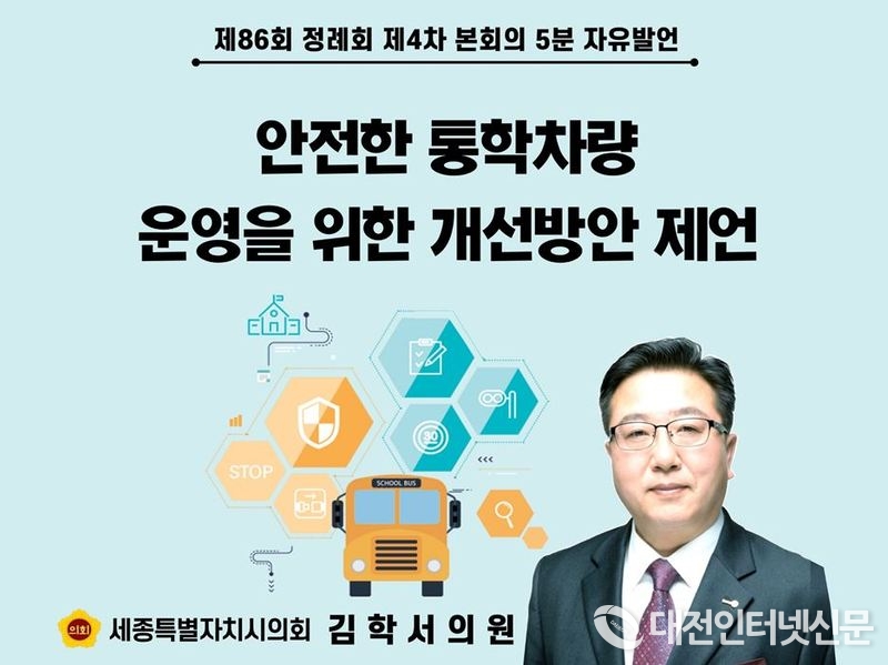 [대전인터넷신문=세종/권혁선 기자] 세종시의회 김학서 의원(전의・전동・소정면, 국민의힘)은 제86회 정례회 4차 본회의 5분 자유발언에서 통학환경이 열악한 지역 학생들의 안전하고 편리한 통학을 위해 “통학차량 운영 개선 방안”에 대한 정책을 제안했다.