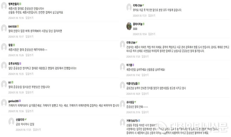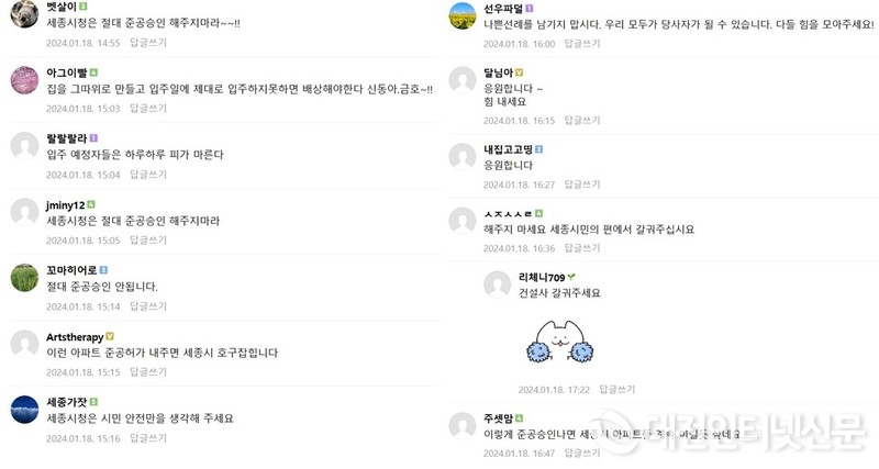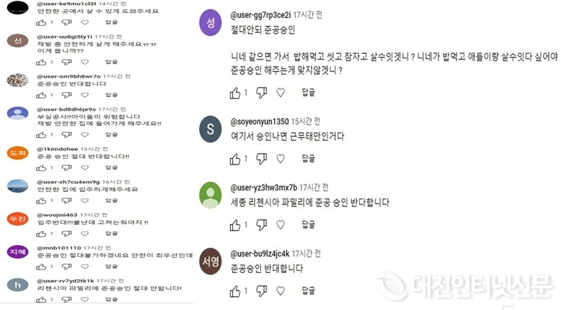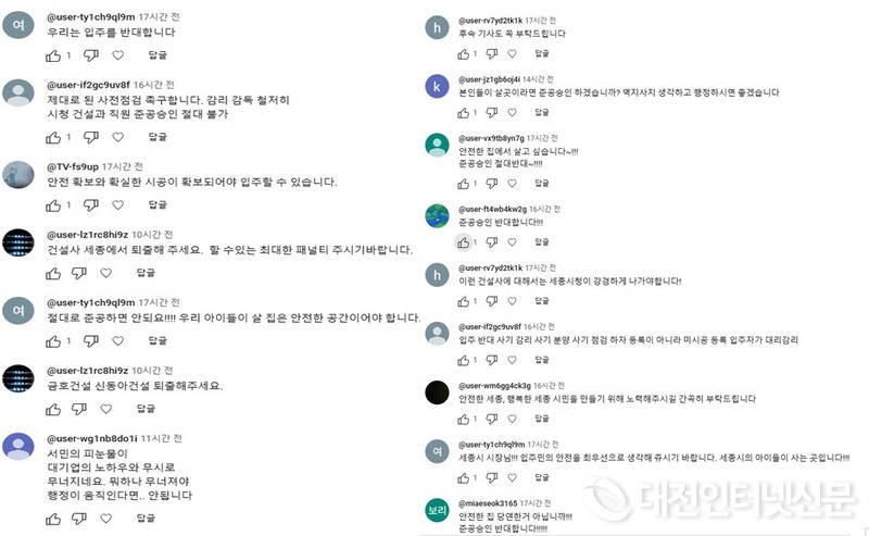 본지(대전인터넷신문) “세종시장님 금호·신동아 리첸시아 아파트 사용승인 불허해 주세요”라는 제하의 기사와 유튜브 영상에도 사용승인 절대 해주지 말고 철저한 진상을 규명하고 부실 시공업체를 퇴출시키라는 댓글이 무성하게 달리면서 리첸시아 문제는 입주예정자를 떠나 세종시 전체 문제로 비화됨을 확인할 수 있었다.