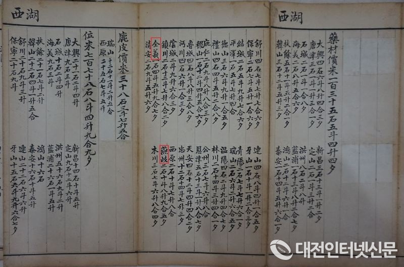 특히 호서지방의 내용도 포함돼 당시 충청지역에 배당된 세금으로 내던 쌀의 수량과 걷어진 대동미 등을 확인 할 수 있다.