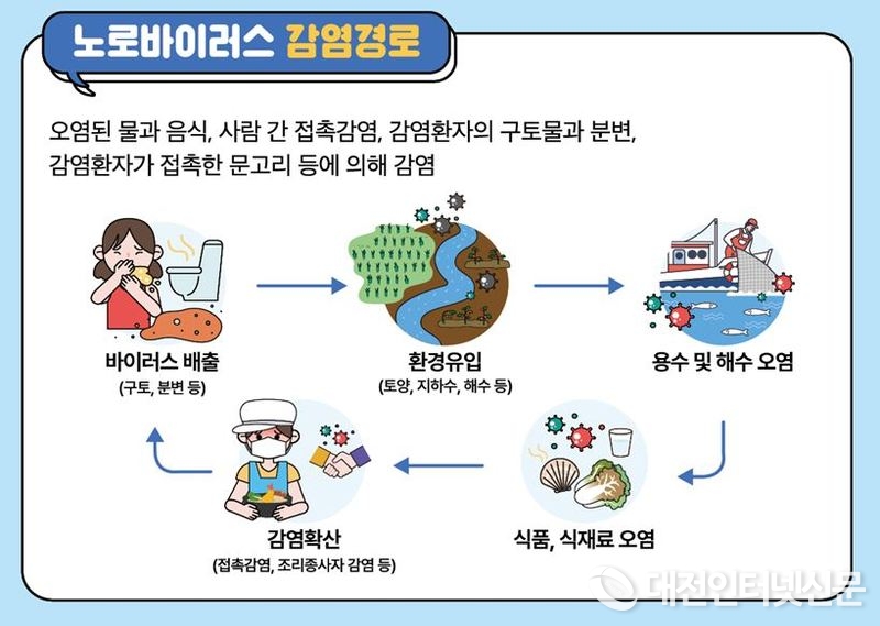 노로바이러스는 감염력이 강하고 저온에서도 생존해 겨울철에서 이듬해 봄(11월~4월)까지 주로 발생하며 감염되면 구토, 설사 등의 증상과 오한, 발열 등이 나타나기도 한다.