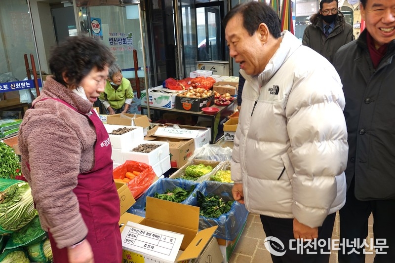 최민호 세종시장이 8일 세종 대평시장을 방문, 상인들을 격려하고 집에서 사용할 식자재를 직접 구입했다. [사진-대전인터넷신문]