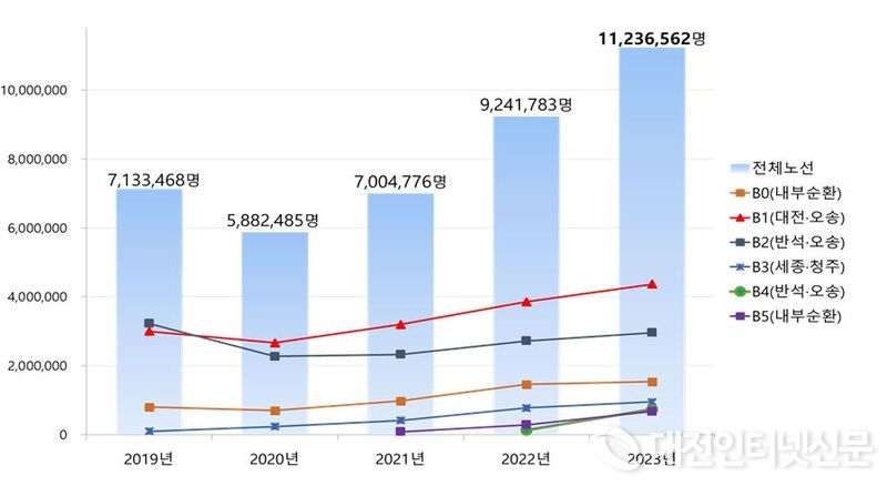 [대전인터넷신문=세종/권혁선 기자] 행복청은 지난해 행복도시권 BRT ‘바로타’ 연간 이용객이 1천만 명을 돌파했다고 밝혔다.