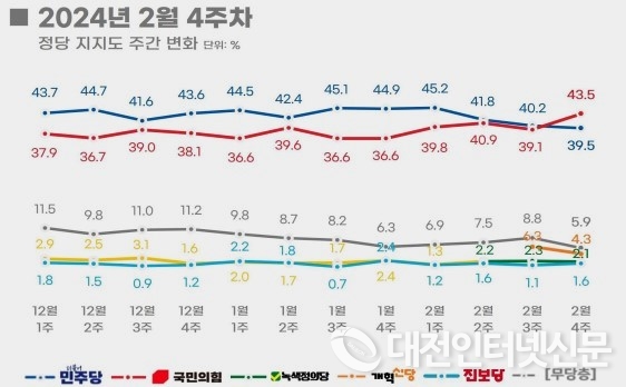 [대전인터넷신문=세종/최대열기자] 제22대 총선이 40여 일 앞으로 다가온 가운데 사천 논란으로 공천 갈등이 격화되고 있는 더불어민주당 지지율이 뚜렷한 하향세를 보이면서 총선 승리에 대한 위기감이 고조되고 있다.