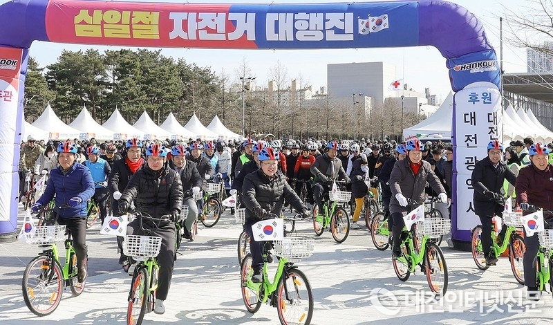[대전인터넷신문=대전/최대열기자] 1일 이장우 대전시장이 엑스포시민광장 일원 일원에서 열린‘3.1절 자전거 대행진 행사’에 참석, 시민들과 함께 자전거를 타면서 선조들의 애국정신을 기렸다.