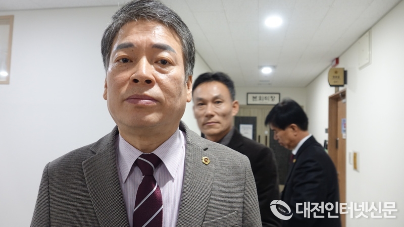 김광운 원내대표와 소속 의원 전원이 민주당의 독선에 반대하며 본회의장을 빠져 니오고 있다. [사진-대전인터넷신문]