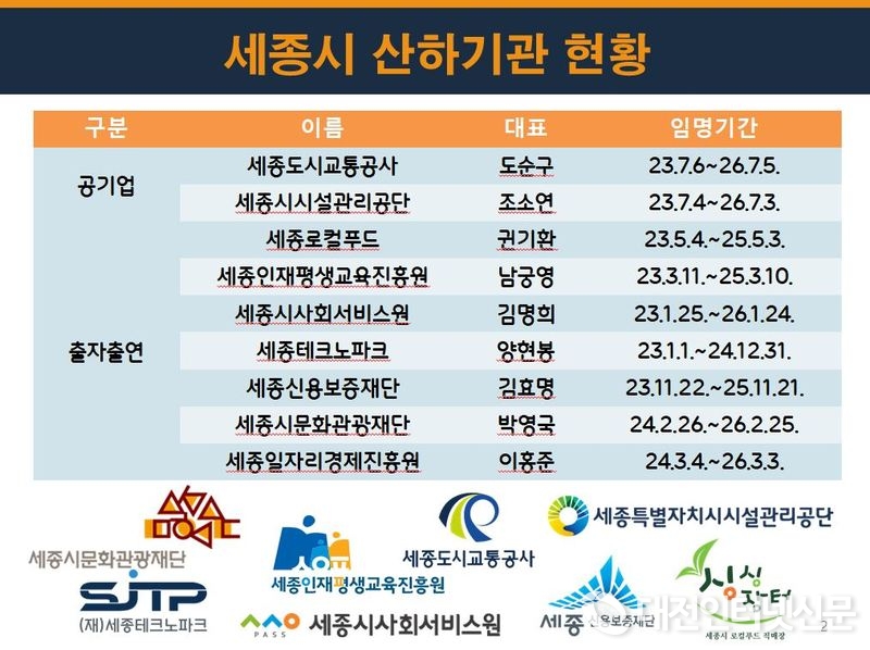 김 의원에 따르면 산하기관장 중 공무원 출신이 존재할 수는 있지만 세종시 산하기관장 대부분이 ‘관료 출신’이라는 점은 최민호 시장의 인사 정책의 한계를 여실히 보여준다.