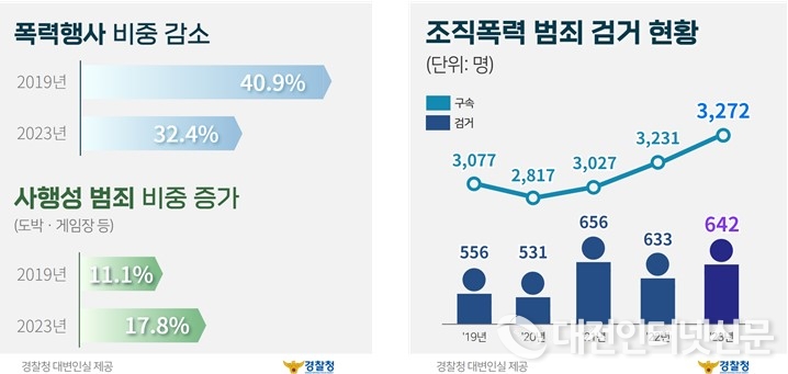 그동안 경찰은 조직폭력 범죄에 대한 전문 수사체제를 구축하고, 다년간 축적된 수사역량을 바탕으로 강력하게 대응한 결과, 2023년 조직폭력 범죄로 3,272명을 검거하였으며, 642명을 구속했다.
