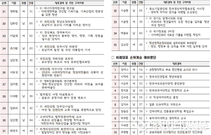 한편, 이번 국민의미래 비례대표 공천 신청은 남성 331명, 여성 199명 등 총 530명이 신청했고 국미의미래는 이중 ▲국민의 눈높이에서 누구나 공감하고 납득할 수 있는 인재인가, ▲몸 담아온 분야의 전문성을 바탕으로 대한민국이 직면한 다양한 현안을 풀어나가기에 충분한 대응 능력을 갖춘 인재인가, ▲이를 바탕으로 국민 삶의 세밀한 부분까지 개선해 나갈 수 있는 역량을 발휘해 나갈 인재인가의 3가지 관점에 중점을 두고 선정했다.