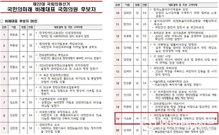 국민의미래는 18일 비례대표 후보자 35명의 명단과 예비자 10명의 명단을 공개 했다. 비례대표에는 진종오(4번 올림픽 금메달리스트), 인요한(8번 前 국민의힘 혁신위원장), 이소희(19번 前 세종시의원)을 포함한 35명이, 예비 비례후보에는 이덕재 전국상인연합회 청년위원장을 포함한 10명이 선정됐다.