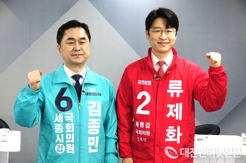 세종갑 후보 토론에 앞서 기념 촬영하는 김종민, 류제화 후보. [사진-대전인터넷신문]