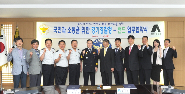 경기지방경찰청(청장 김종양)은 7. 30일 경기지방경찰청과 지역주민 간의 대표 소통창구로서 그룹형 SNS 밴드를 활용하기 위해 캠프모바일(공동대표 박종만․이람)과 업무협약(MOU)을 체결하였다.