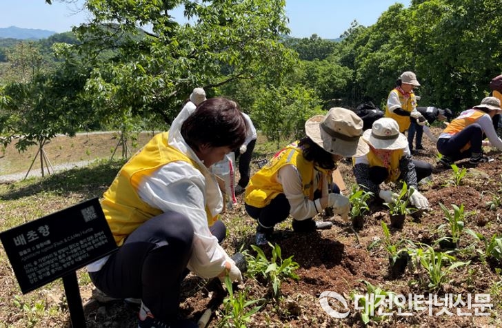 14일 한국수목원정원관리원, 대한적십자사, 대전광역시 서구, 한국식물원수목원협회와 함께 노루벌적십자사생태원에서 진행한 야생화 심기 캠페인에 참여자한 봉사자들이 배초향을 심고 있다. [사진-한수정]