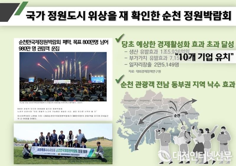 또한 2013년에 이어 올해 두 번째 정원박람회를 개최한 순천시를 예로 들며, 목표치를 초과한 980만 명 이상이 방문해 우리나라를 대표하는 국가정원도시로 인정받고 있음을 설명했다.