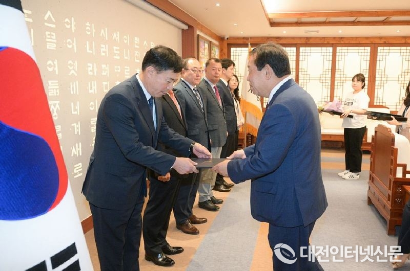 최민호 시장은 27일 시청에서 제2기 세종자치경찰위원회 위원들에게 임명장을 수여했다. 제2기 세종자치경찰위원회는 충북경찰청장을 역임한 남택화 위원장과 김영식 서원대 교수, 김정환 한국영상대 교수, 김재선 전 홍성경찰서장, 김흥주 대전세종연구원 책임연구위원, 도현택 변호사, 성은정세종참여자치시민연대 사무처장 등 7명의 위원으로 구성됐다.