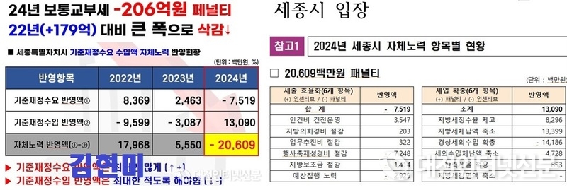 세종특별자치시의회 김현미 의원(소담동,더불어민주당)은20일 제89회 정례회 제1차 본회의 긴급현안질문을 통해“세종시가 방만한 예산집행으로 올해보통교부세206억9백만 원의 교부세를 삭감당했다”라며 이에 대한 구체적이고 현실적인 대책 마련을 촉구하는 동시에 “지방교부세법 제8조의 3 제1항에 따라 세종시는 건전재정운영을 위한 자체노력 결과 2022년에는 179억 6천8백만 원, 2023년에는 55억 5천만 원의 인센티브를 받았지만 2024년에는 206억 9백만 원에 이르는 막대한 페널티를 받았다”라고 주장한 바 있다.