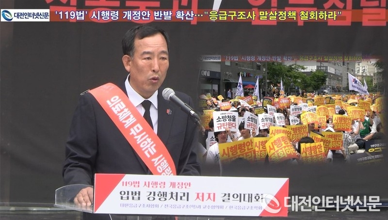 대한응급구조사협회 강용수 회장이 119구조·구급에 관한 법률 개정(안) 철회를 촉구하고 있다. [사진-대전인터넷신문]