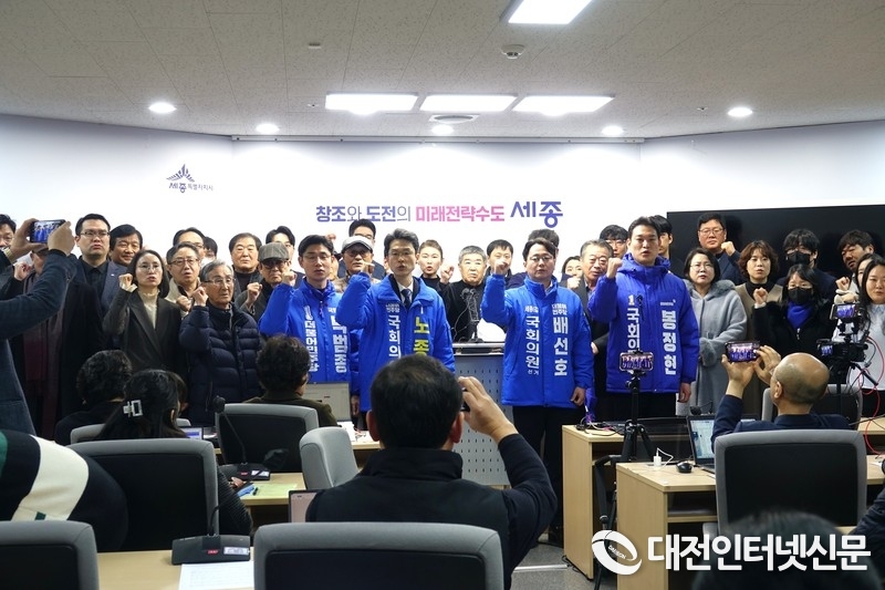 지난 2월 19일 더불어민주당 세종갑 노종용, 배선호, 박범종, 봉정현, 이영선 예비후보 5인이 세종시청 정음 실에서 공정 경선을 실할 것을 촉구하고 전략공천설의 중심에 선 이강진 예비후보의 출마포기를 촉구하고있다. [사진-대전인터넷신문]