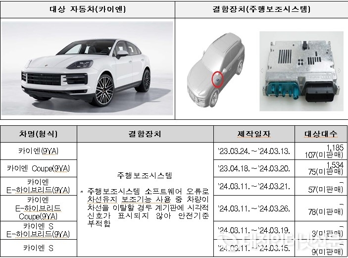 포르쉐 카이엔 등 8개 차종 3,087대는 주행보조시스템 소프트웨어 오류로 차선 유지 기능 작동 중 운전자에게 시각 신호를 알리지 못하는 안전기준 부적합으로 6월 7일부터 시정조치를 진행하고 있다.