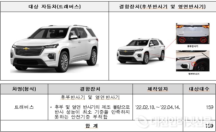 지엠)트래버스 159대는 후부 및 옆면 반사기의 반사 성능이 최소 기준을 만족하지 못하는 안전기준 부적합으로 6월 12일부터 시정조치를 진행하고 있다.