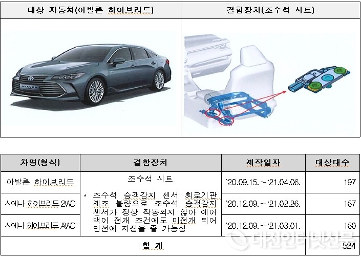 토요타 아발론 하이브리드 등 3개 차종 524대는 조수석 승객 감지 센서 회로기판 제조 불량으로 6월 13일부터 시정조치에 들어간다.