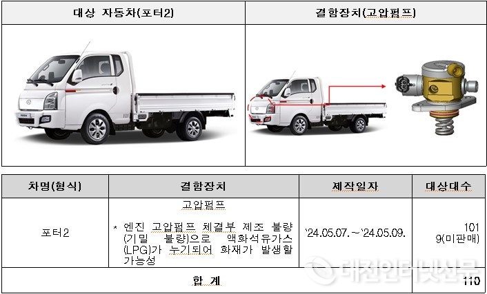 현대 포터2 110대는 엔진부 고압 펌프 제조 불량으로 6월 18일부터 시정조치에 들어간다.