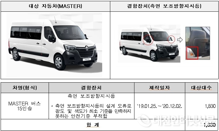 르노 MASTER 1,830대는 측면 보조방향지시등의 광도 등이 최소 기준을 만족하지 못하는 안전기준 부적합으로 6월 7일부터 시정조치를 진행하고 있다.