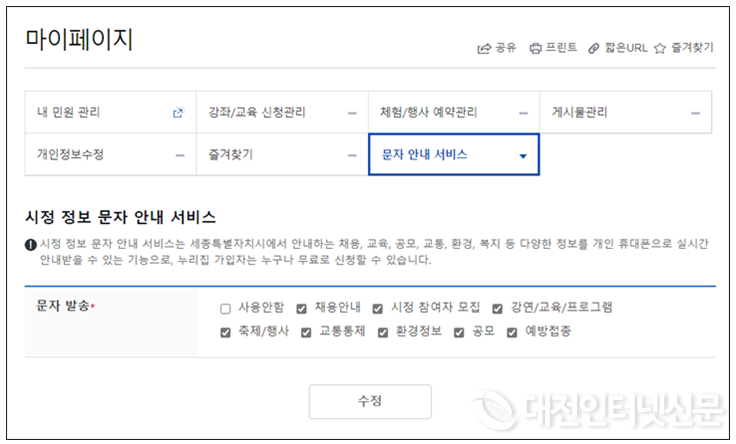 서비스 신청은 시 대표 누리집 회원가입 후 마이페이지 화면에서 하면 된다. 개인별로 원하는 문자 안내 항목을 선택하면 맞춤형 정보를 무료로 받아볼 수 있다.