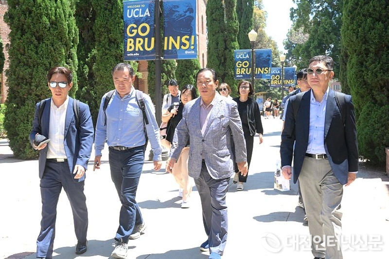 UCLA(University of California, Los Angeles, 이하 캘리포니아대학교) 교정을 거니는 최민호 시장 일행. [사진-세종시제공]