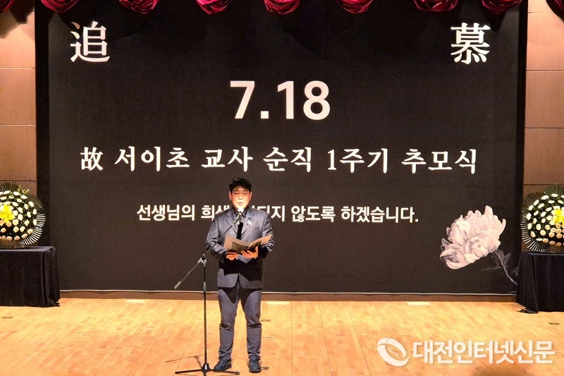 [대전인터넷신문=세종/권혁선 기자] 세종시교원단체총연합회는 지난 18일 저녁 6시 공주교육대학교 청목관 정화홀에서 세종교총과 충남교총 공동 주최로 故 서이초 교사 순직 1주기를 맞아 교육에 헌신하다 유명을 달리한 모든 선생님을 애도하고 뜻을 기리는 추모식을 실시했다.