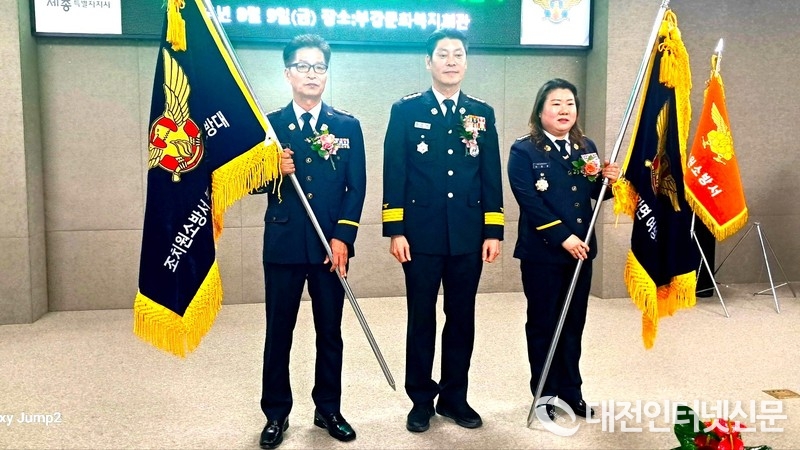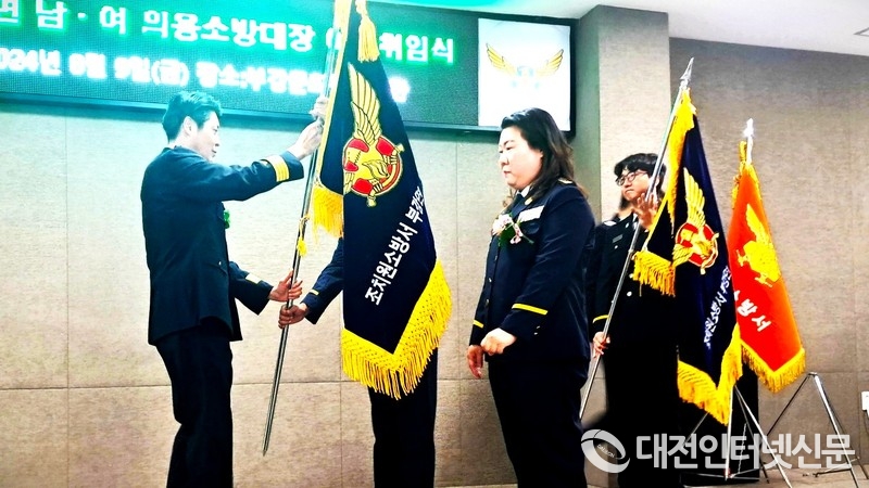 부강면 남녀의용소방대장 이취임식에서 새롭게 취임하는 왼쪽 최학수 대장과 오른쪽 박현정 대장의 모습. [사진-대전인터넷신문]