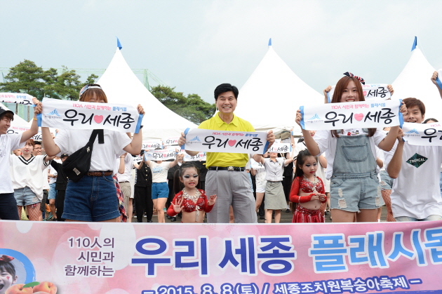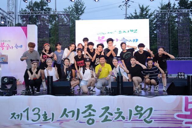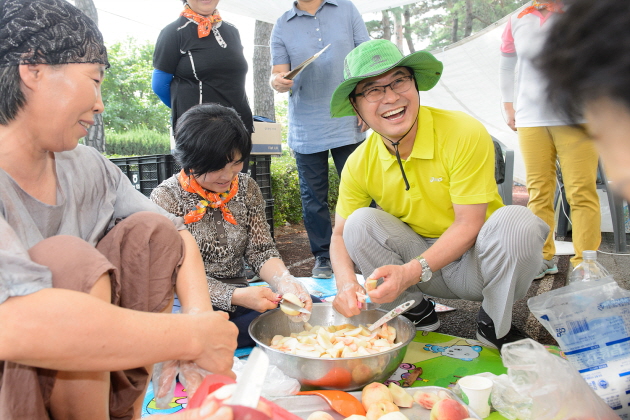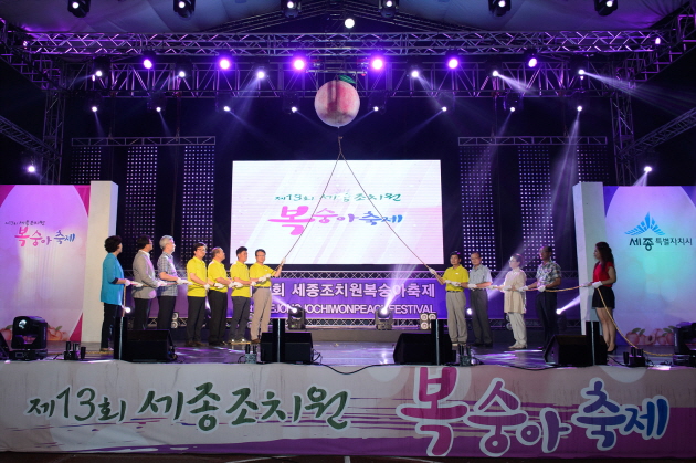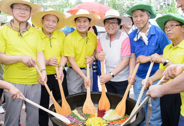 제 13회 세종조치원 복숭아 축제가 8~9일 이틀간 고려대학교 세종캠퍼스에서 열렸다. 8일 오후 이춘희 시장(왼쪽에서 3번째)과 임상전 시의회 의장(왼쪽에서 2번째), 최교진 시 교육감(왼쪽에서 4번째) 등이 함께 110인분 복숭아 비빔밥 만들기 체험에 나선 모습.