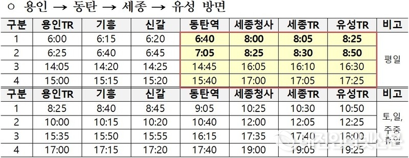 유성 → 세종 → 동탄 → 용인 방면은 평일 및 토·일·주중휴일은 모든 회차 유성·세종·세종청사 승차시간은 전과 동일 → 신갈·기흥·용인까지 도착시간은 동탄역 추가정차로 각 20분 순연된다.