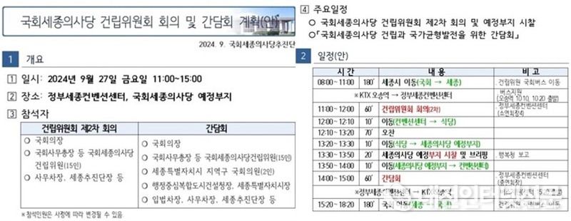 우원식 국회의장을 비롯한 위원들은 오전 11시부터 세종컨벤션센터에서 건립위원회 2차 회의를 개최하고 오후 1시에 세종의사당 예정부지에서 시찰을 겸한 행복청 보고를 청취한 후 다시 세종컨벤션센터로 이동 1시간가량 간담회를 개최할 예정이다.