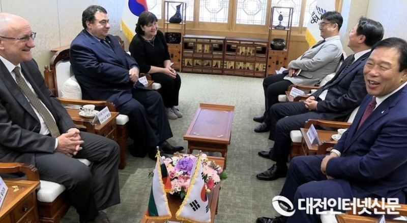 지난해 10월 19일 최민호 시장이 페트코 드라가노프(Petko Draganov) 주한 불가리아 대사와 카린 데미아노프(Kalin Damianov) 한·불 상공회의소 회장을 만나 교류협력 강화 방안을 논의하고 있는 모습. [사진-대전인터넷신문]