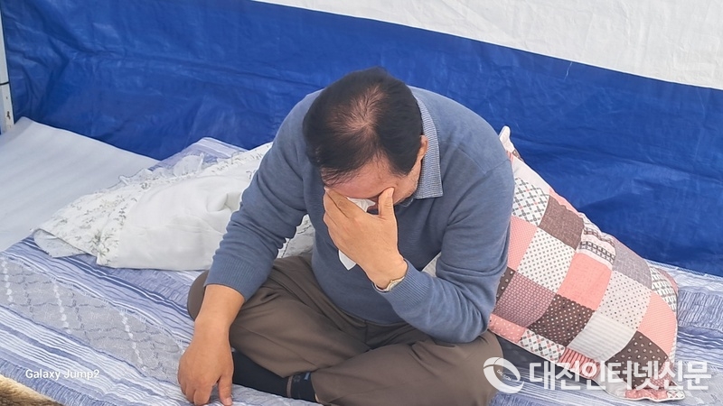 [대전인터넷신문=세종/최대열 기자] 최민호 세종시장의 단식 5일 차이자 의회 본회의 개최 하루 전인 10일 오후 1시 30분경 최민호 세종시장의 단식 장소에 혈서를 쓴 세종시민이 최 시장을 방문, “시장님 힘내십시오, 민주당 시의원을 포함한 국회의원 모두를 시민이 직접 심판할 것이다”라며 최 시장에게 힘을 실어줬고 이에 최 시장은 “이건 아니다”라며 하염없는 눈물로 심경을 대변했다.