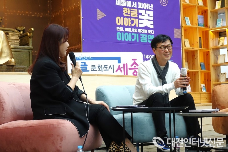 한글문화도시 토크콘서트 대담을 진행하는 최민호 세종시장. [사진-대전인터넷신문]