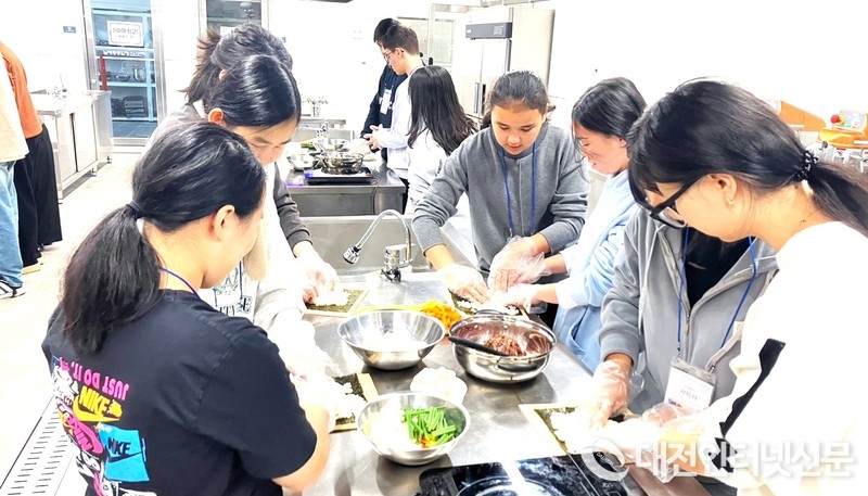 새뜸중 학생들과 우즈베키스탄 학생들이 함께 문화 체험을 하고 있다. [사진-세종시교육청]