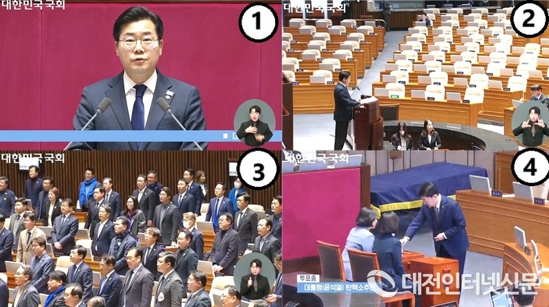 [대전인터넷신문=세종/최대열기자] 7일 헌정 사상 최초로 진행된 대통령 부부가 탄핵과 특검 심판대에 선 가운데 김건희 특검은 부결됐고 윤석열 대통령 탄핵소추안은 195명이 투표하면서 정족수 200명을 채우지 못하고 결국 불성립으로 막을 내렸다.