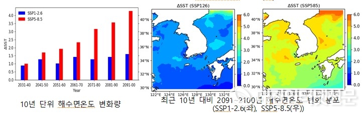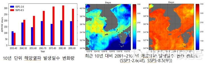 해양 열파 변화를 분석한 결과, 21세기 말 발생일수와 발생 강도 모두 최근 10년에 비해 증가하고, 고탄소 시나리오에서는 변화폭이 매우 큰 것으로 전망됐다. 고탄소 시나리오에서 발생일수는 295.5일, 발생 강도는 2.54℃ 증가하였고, 저탄소 시나리오보다 각각 100일, 2℃ 이상 더 증가하여 1년 중 대부분이 높은 강도의 해양 열파에 노출되는 것으로 나타났다. 해양 열파의 발생일수와 발생 강도가 증가하면서 향후 한반도 주변 해양에서 해양생태계 파괴 등 해양기후변화로 인한 영향이 심화되고, 폭염 등 극한 기상 발생이 증가할 우려가 있다.